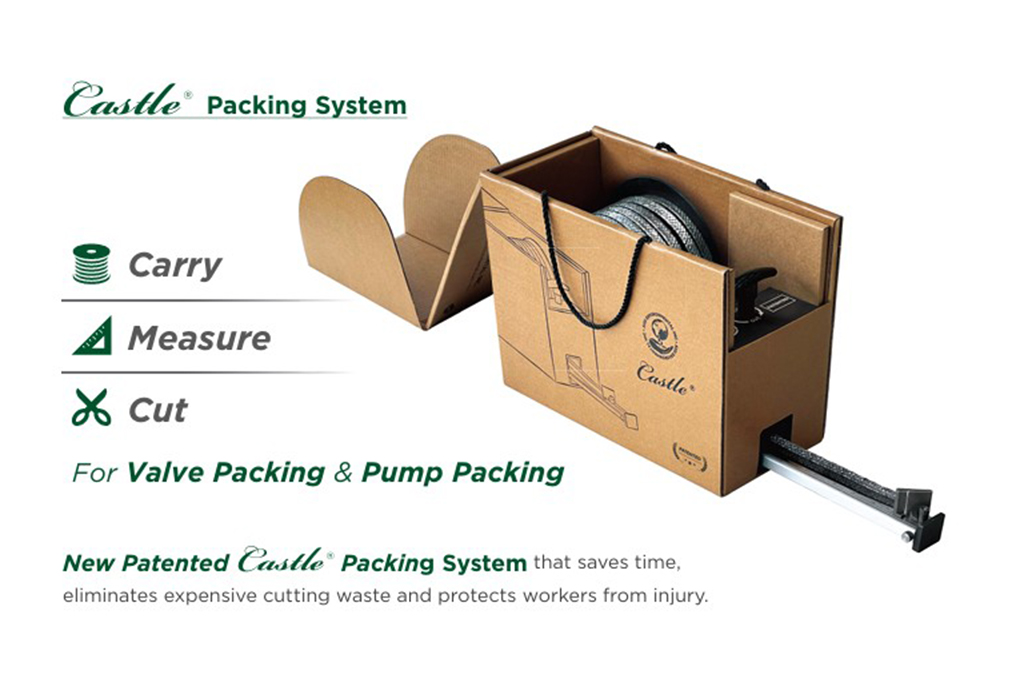 Cajas únicas y patentadas que permiten medir y cortar la empaquetadura en cordón desde la misma caja. Protegen el empaque mientras minimizan el desperdicio y evitan la contaminación de la empaquetadura durante el corte.